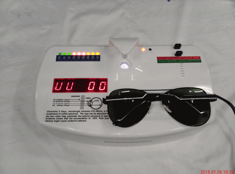 本廠太陽鏡均通過“UV-400”檢測,帶UV400的鏡片才能阻擋全部紫外線,100%地反射、吸收紫外線,而一般的太陽眼鏡只可將光度降低,不能阻擋紫外線。如果一副太陽鏡只能擋住強光而不能阻隔同等量的紫外光,對配戴者而言,將會接受比不戴太陽鏡更多的紫外光(戴上太陽鏡,會降低進入人眼光通量,致使配戴者瞳孔增大反而使進入的紫外線更多),進一步加深了對眼睛的損害。