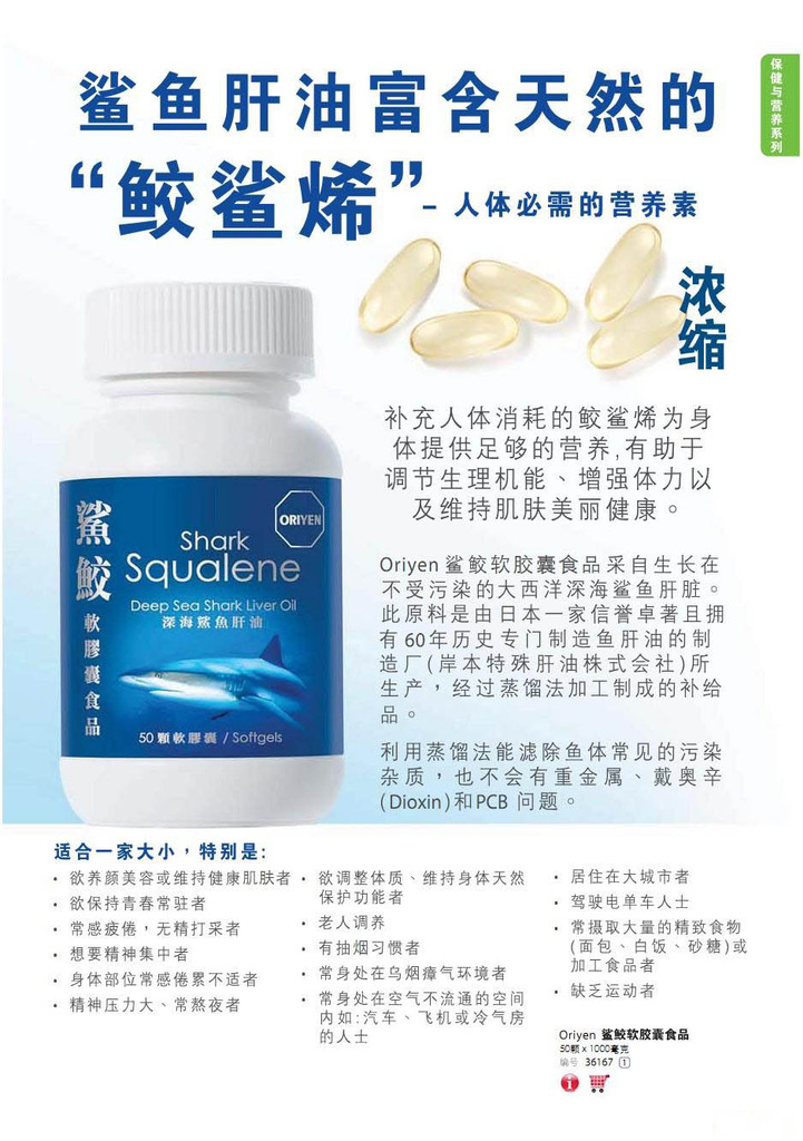 Oriyen 鯊鮫軟膠囊食品(深海鯊魚肝油)富含天然的鮫鯊烯,是維持人體健康的重要元素。它能提升人體和細胞的含氧量,加速新陳代謝和血液循環、強化免疫系統、締造更健康的皮膚和生理機能、減低罹患癌癥和慢性疾病的風險等,絕佳適合一家大小服用。其效用安全,不含污染雜質、重金屬、戴奧辛(Dioxin)及PCB問題。