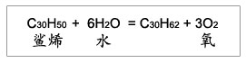 角鯊烯的分子構造式為“C30H50”,是一種不安定的型態。由于缺少12個氫元素,角鯊烯的分子必須一直尋找氫元素以補足,而其來源就是水(H2O)。當角鯊烯從水分子中奪走氫原子后,就會產生3個氧氣(O2)。