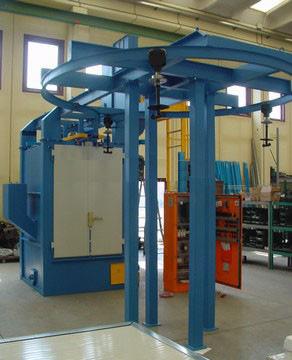 吊鉤式拋丸機分為單吊鉤和雙吊鉤,吊鉤式拋丸機由兩個吊鉤裝載工件交替進入拋丸清理室內。利用拋丸器將0.2~0.8的彈丸拋向工件的表面,使得工件的表面達到一定的粗糙度,讓工件變得美觀,或者改變工件的壓應力提高壽命。本機型廣泛應用于鑄造、建筑、化工、電機、機床等行業的中、小型鑄、鍛件的表面清理或強化處理。吊鉤式拋丸清理機為吊鉤式清理設備,由拋丸清理室、提升機、分離器、螺旋輸送器、兩個拋丸器總成、彈丸控制系統、吊鉤行走軌道、吊鉤系統、自轉裝置、地基、除塵系統及電氣控制部分等組成。