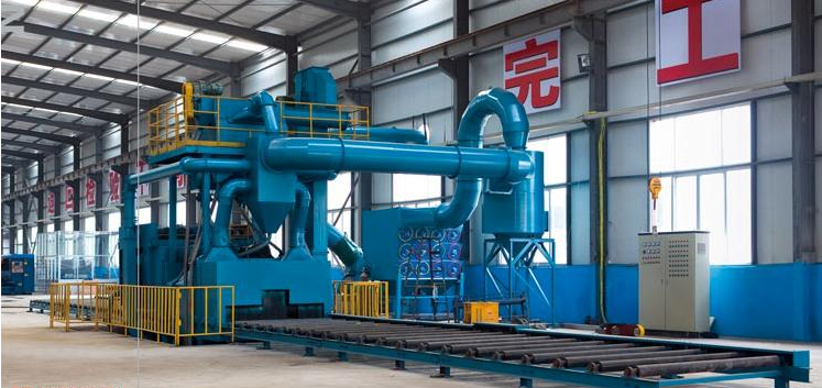 該機主要利用高效強力拋丸器拋出的高速丸流,拋打位于室體內的旋轉工件表面與內腔上,去掉其它的粘砂、銹層、焊渣、氧化皮及其雜物,使之獲得精細的光潔表面。提高了漆膜與鋼材表面的附著力,并提高鋼材的抗疲勞強度和抗腐蝕能力,改善了鋼材的內在質量,延長其使用壽命。該設備主要由清理室、拋丸器總成、輸送輥道、上料機構、卸料機構、螺旋輸送器、提升機、維修平臺、分離器、除塵系統及電控系統等組成。