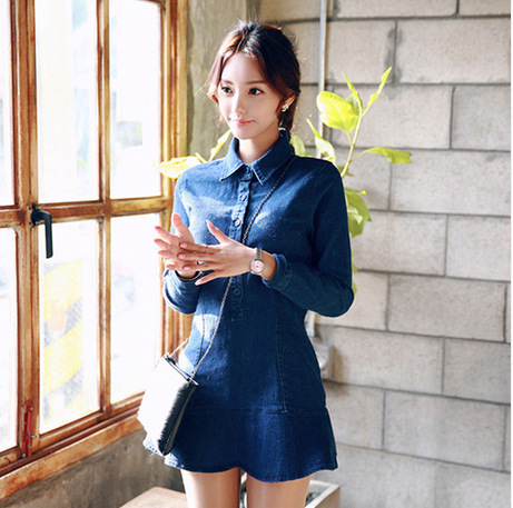 韓國街拍范兒休閑百搭荷葉邊牛仔連衣裙必入