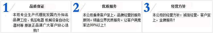 * 主營:繼電器、斷路器、接觸器、 起動器、光纖放大器、接近開關、光電開關行程開關、氣動元件、微動開關、編碼器 。代理分銷國外品牌有施耐德、ABB、西門子、歐姆龍、和泉、圖爾克、奧托尼克斯、富士、三菱、松下、天得、基恩士、神視、施克、圖爾克、巴魯夫易福門、倍加福、皮爾茲、等各種知名品牌低壓電器。 公司秉承“顧客至上,銳意進取”的經營理念,堅持“客戶”的原則為廣大客戶提供優質產品和周到的服務。歡迎廣大客戶惠顧!