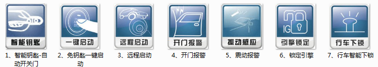1、智能身份識別開關鎖:當您離開車輛3米時,智能偵測系統在設定范圍內無法尋找到“智能鑰匙”的信號會第一時間自動鎖車,同時轉向燈閃爍,嗽叭短響,提示車主車輛已自動進入防盜狀態。當您走近車輛,智能偵測系統會在2米范圍內自動解鎖;