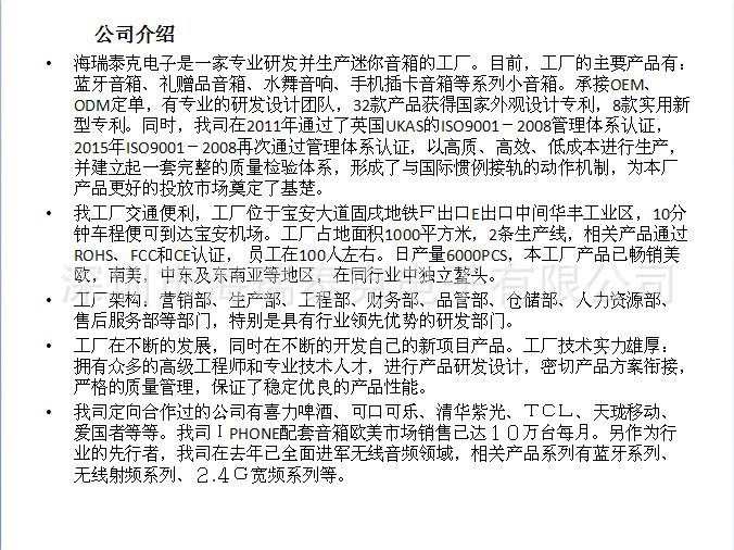 海瑞泰克是一家專業研發并組裝迷你音箱的工廠。目前,工廠的主要產品有:藍牙音箱、無線射頻音箱、手機插卡音箱、IPHONE音箱和音箱包等系列小音箱。我工廠主要生產OEM、ODM定單,有專業的ID團隊研發設計,目前有21款產品獲得國家外觀設計專利,其中一些款式為實用新型專利。同時,我司在2011年通過了英國UKAS生產體系的ISO9001-2008質量管理體系認證,以此高質、高效、低成本進行生產,并建立起一套完整的質量檢驗體系,形成了與國際慣例接軌的動作機制,為本廠產品更好的投放市場奠定了優質基礎。