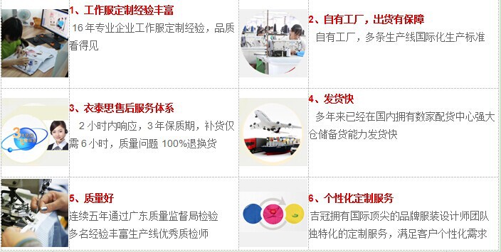 我廠還在部分地區設有工作服、襯衫、高檔西服等服裝銷售店。 本廠深信品質是決定每個企業的生存根源,秉著誠信務實,進取創新的企業精神,努力開拓,為新老客戶提供優質的產品、更滿意的服務。我們的口號是“品質為上,信譽”。誠信與守信對待每一個客戶。
