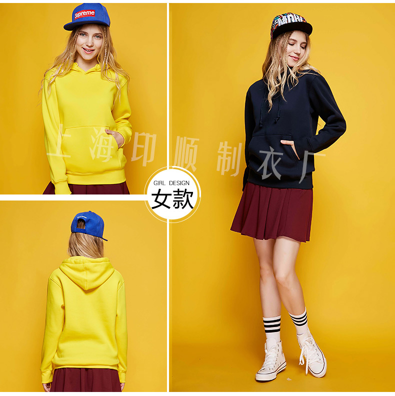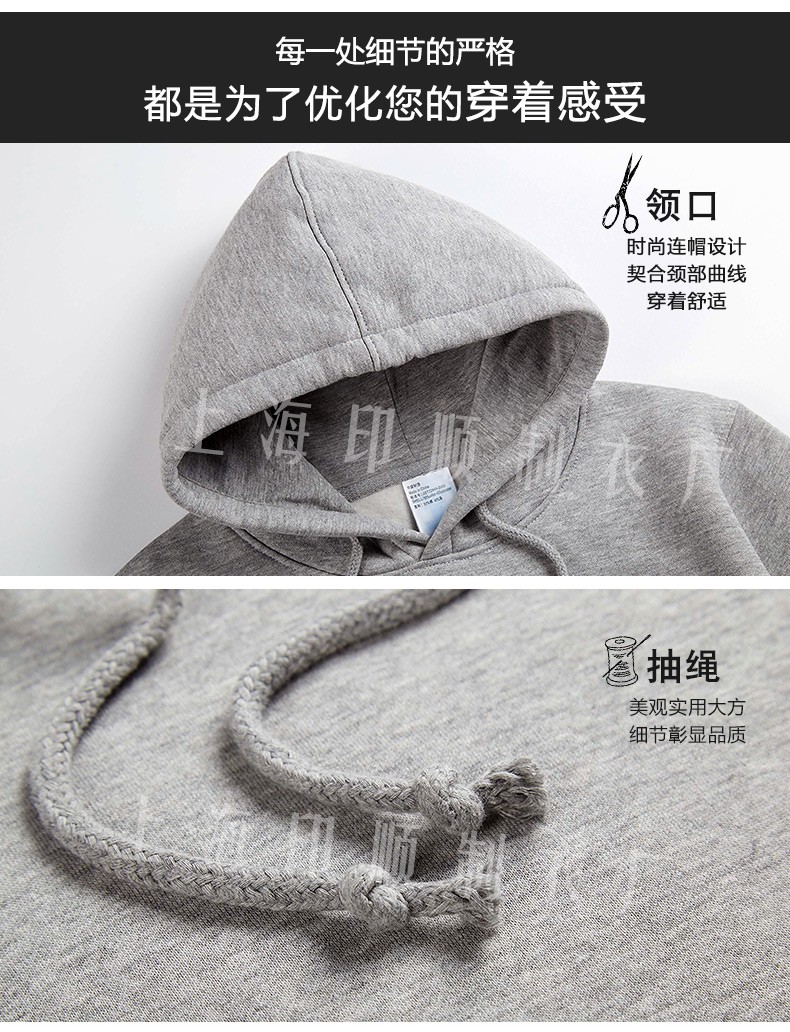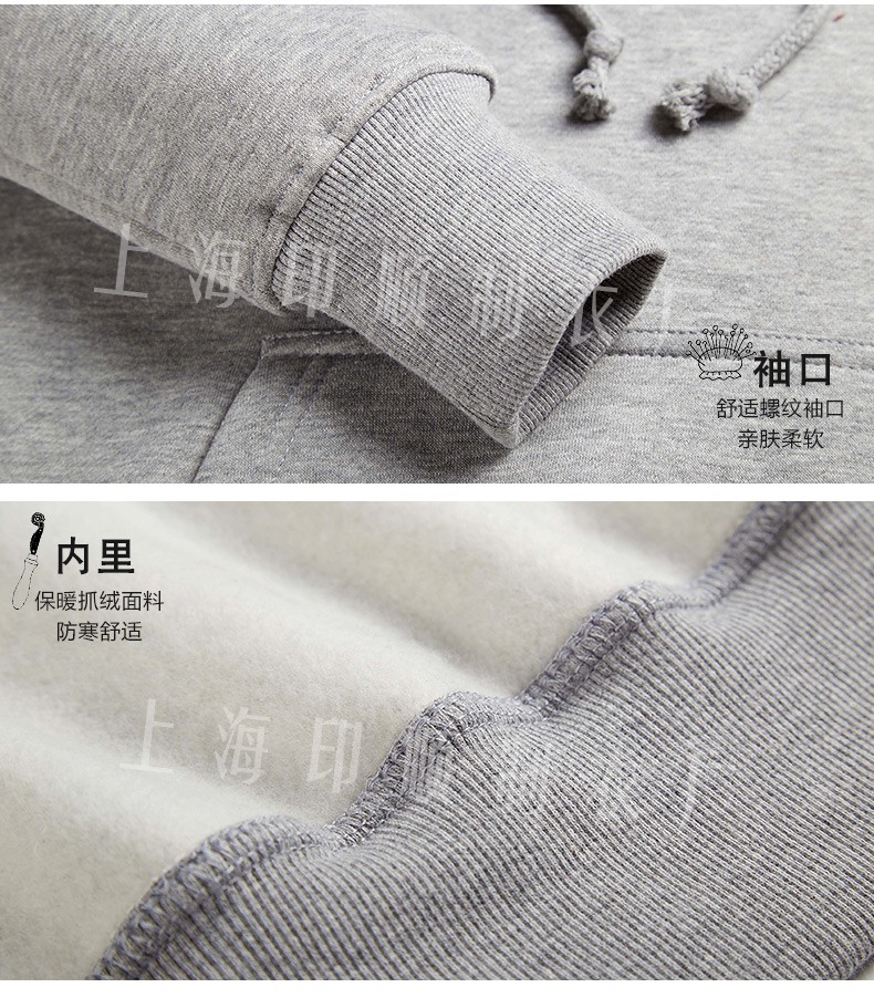 領口:時尚連帽設計,契合頸部曲線穿著舒適。抽繩:美觀實用大方。袖口下擺:舒適螺紋,親膚柔軟。每一處細節的嚴格,都是為了優化您的穿著感受!套頭連帽袖口緊縮有彈性,衣服下邊和袖口的料子是一樣。衛衣以其舒適寬松的版型,帶點叛逆味道為大眾所喜愛。衛衣在年輕一族衣柜里不可少。