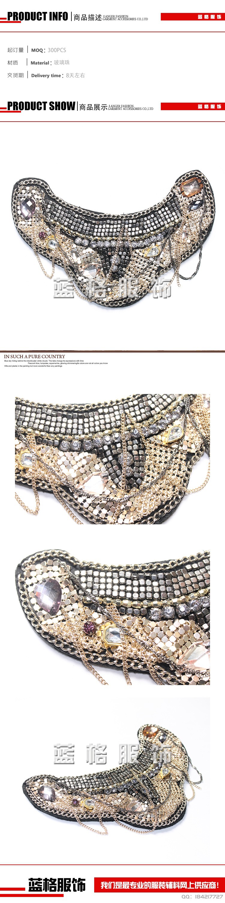 ◆公司還擁有超過1000款以上的各種服裝輔料現貨批發,包扣:花邊、衣領、假領子、鞋花、項鏈飾品,款式還在不斷的增加中。