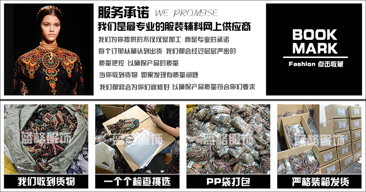 注意:我們網站上有些款式為加工定制款(沒有現貨),主要用于服裝服飾上面,屬于半成品輔料。如果客戶需要樣品可以聯系我們看有沒有現成樣品或者客戶也可以提供圖紙或者實樣來打版訂做。