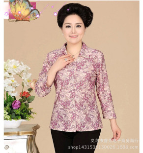 爆款冰絲印花翻領長袖襯衫中老年女裝寬松大碼百搭女秋裝上衣批發¥ 13.5