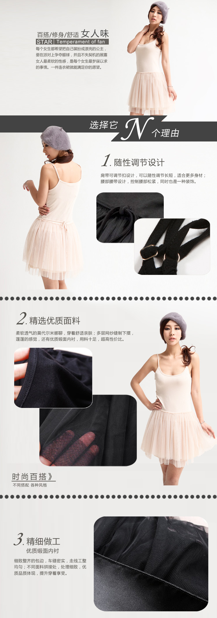 我們采用的是莫代爾的吊帶面料,下擺是兩層網紗加一層內襯哦