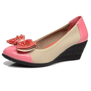 2013秋季新款真皮坡跟高跟串珠淺口拼色單鞋休閑低幫女鞋一件代發
