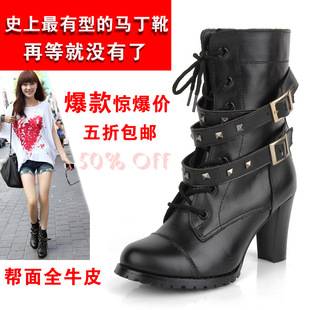 韓版時尚鉚釘馬丁靴 真皮機車女靴 高跟中筒靴子 女鞋 溫州廠家