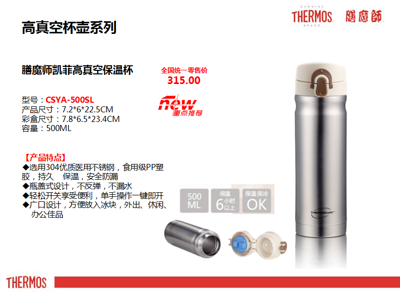 膳魔師杯壺是我們日常所見的一種高檔杯壺,它的中國工廠就在我們江蘇省昆山市,膳魔師就像我們在鋼筆中的派克一樣,擁有著很高的知名度,隨著時代的進步和發展,這些高端品牌的東西也會越來越多的出現在我們老百姓的生活視野中!膳魔師保溫杯是設計比較人性化,為廣大消費者提供了很多的便捷攜帶?,F在杯身也可以定制廣告,為更多的企業選擇高端禮品提供了一個很好的方案,所以也越來越暢銷!本公司有大量膳魔師杯對外出售,可加工定制印logo,歡迎大家前來公司選購定制! 膳魔師保溫杯系享譽國際已百年之全球知名高真空系列產品品牌THERMOS(膳魔師)家族的一員。膳魔師致力研發的高科技真空技術,將雙層優質不銹鋼內部抽真空處理,容器內的真空隔熱層,能有效的達到保溫效果,膳魔師保溫杯保證能夠給您很好的保溫效果,讓您的食物、飲品保溫時效更長久,更新鮮! 太空杯系類人性化拎帶或拉環設計,便于攜帶,適合家庭休閑,戶外旅行,抗震防摔、不易破碎、經久耐用