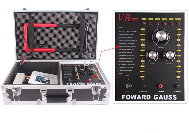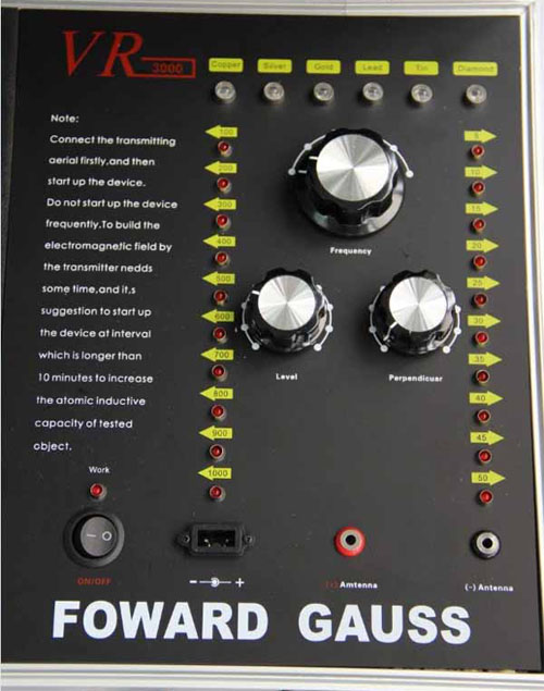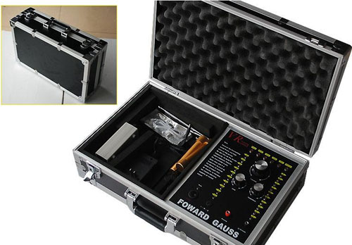 一個鑲有鋁邊并帶有把手和兩把鎖的黑色盒子,該盒子里裝有發she器和其它附件。該發she器是安裝在盒子里,發she器的面板上有六個LED頻率指示燈,且每個指示燈都代表某項功能,字母C開頭的表示銅,字母S開頭的表示銀,字母G開頭的表示金,字母L開頭的表示鉛,字母T開頭的表示錫,字母D開頭的表示寶石。在指示燈的下面有個頻率選擇開關,可以自由調節您所需要探測的金屬種類。頻率選擇開關的下面,有兩個旋鈕,分別標有"水平"、"垂直"字樣,分別代表探測深度與范圍。左右各有一豎排十個指示燈,可以用水平或者垂直鈕來調節您所要選擇的探測深度和探測范圍(探測深度為5-50M,每5M一個指示燈共計十個,探測范圍為100-1000M,每100M一個指示燈共計十個)。主機面板最下方一排從左起為電源總開關,電源充電孔,以及一紅一黑的兩個發射天線插孔。充電電路已經被設計在儀器內部,電池安裝在儀器中部的面板下面。(切記:充電時請先用大陸公司贈送的220V轉110V的轉換器插入家用電插座然后將充電器接插在轉換器上)
